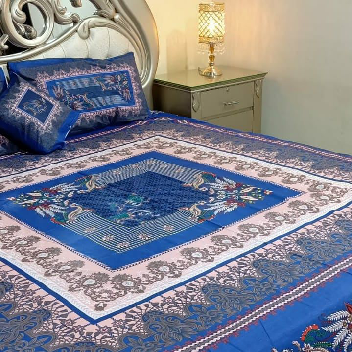 Available as Designer Bed Sheet Set – 4pcs, made from soft and durable Percale fabric with high-quality panel designs and permanent color. Includes 1 king size sheet, 2 pillow covers, and 1 cushion cover. For sale online in Faisalabad, Lahore, Karachi, Islamabad and all Pakistan. ✅ Cash on Delivery ✅ Fast Shipping.
